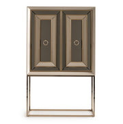 AICO Furniture Madison 2pc Bar KD in Glistening Gold LFR-MDSN500K-827. Succumb to the Madison Bar's charm. Bronzed doors open to reveal a world of shelved secrets, offering an intoxicating blend of sophistication and functionality. Raise a glass to exceptional taste and design. Cheers!