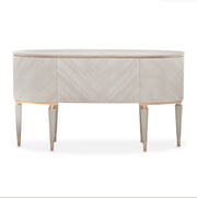 AICO Furniture St.Charles Vanity Desk in Dove Gray 9088058-803. The Saint Charles Vanity elegantly serves a dual purpose, blending the luxurious elements of a grooming haven with the practicality of a writing desk. Its polished surface and ample drawer space make transitioning from beauty rituals to writing endeavors seamless and stylish. The piece is a modern-day essential, promising to add functionality and grace to your personal space.