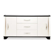 AICO Furniture Tuxedo Sideboard in Piano Keyboard 9087007SA-832. Crowned with a sleek marble inlay, the Tuxedo sideboard combines exquisite aesthetics with practical design. The elegant white surface is complemented by spacious cabinets and drawers, including discreet side storage that seamlessly blends with the unit's sophisticated silhouette. Inside, a silverware tray adds a thoughtful touch, ensuring your finest pieces are stored with the care they deserve. Whether hosting a gala or a quiet family dinner, the Tuxedo Sideboard stands as a symbol of gracious living.