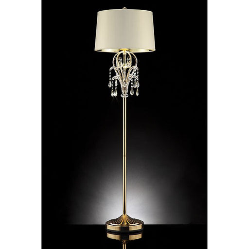 Beautiful dangling crystals are the crown jewels of this luxurious hanging lamp. The metal base and ivory shade add to the simple yet classy design.