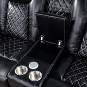 Take your living space to another level with this cozy and futuristic ensemble. Plush backs and arms are adorned with diamond stitching on smooth leatherette. Underneath each arm is extra storage. The main draw here is the LED lights on bottom edge of this loveseat--lighting that lifts the mood from unexpected to exotic. It is equipped with a center console with storage, cup holders, and Bluetooth audio speakers, which if used smartly, can definitely change the evening's mood.