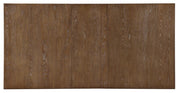 Delight family and guests alike in this rich rustic oak ensemble. The dining table features a distinctive trestle base with circular legs and wide stable feet, holding up a spacious table top, which expands with an 18-inch leaf. The bold table top and base are complemented beautifully with the same circular motif found on the backs of the wooden matching chairs. Seat cushions are padded in a warm beige linen fabric that helps achieve an artful balance of beauty and function.