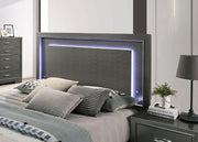 ALISON Cal.King Bed, Dark Walnut, 88 3/8"L X 79 3/8"W X 51"H, 133.3lbs. Illuminate any space with this beautiful bedroom set. A strip of LED light is hidden behind the headboard's textured main panel, which results to a visually stunning glow around the rectangular centerpiece. Mysterious and cool at the same time, the light reflects on to each piece of the ensemble, which features a gray finish with a slight sheen. Translucent hardware made of acrylic materials adds to the luminous potential of this dazzling set.