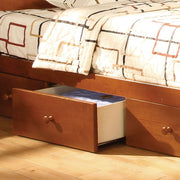 Sized to fit, this casual and transitional bedroom set is perfect for a child's room. The bed features a paneled headboard and has options for a twin trundle or roomy drawers underneath. The matching case goods are accented with wooden knobs and finished in oak or cherry.