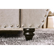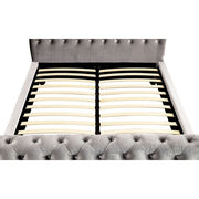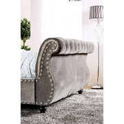 NOELLA Cal.King Bed, 113"L X 80 1/2"W X 53 1/4"H, 237.16lbs. Equipped with slat kits, this padded gray fabric bed is available in three sizes, each of which enhance the scrolled sleigh structure and deep button tufting. The delicate curved design is accented with crystal-like acrylic buttons and trailed by shined nailhead trim.
