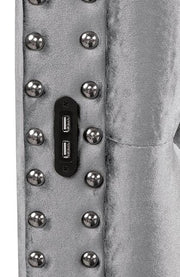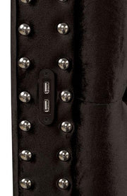 SANSOM E.King Bed, Black, 103 1/2"L X 109 1/2"W X 56"H, 297.44lbs. There's something special about a round bed, and this piece certainly exudes that air of glamour. It is upholstered in velvet-like fabric and tufted all around with acrylic crystals. The stylish wingback headboard with nailheads curls up top into a chesterfield-inspired design. Then there's the USB port present on each side of the headboard to keep your electronics charged up. Just imagine yourself opening a door and being greeted by this sultry--and surprisingly tech-forward--masterpiece.