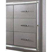 BELLANOVA Silver Cal.King Bed, 91 7/8"L X 79 1/2"W X 65"H, 213.4lbs. Specifically designed to accentuate a glamorous feel, this bedroom collection brings a combination of class and contemporary style to your bedroom. Crocodile embossed veneer and silver lining panels stand out throughout every piece while the button t ufted headboard adds a charming effect. The headboard has built-in LED lights to illuminate the mood. Features: Contemporary Style Crocodile-Textured Detail Padded Leatherette H/B Felt-lined Top Drawers Diamond Crusted Bar Pull Handles Button Tufted Detail Solid Wood, Wood Veneer, Others