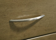 Transform your bedroom into a stylish and serene retreat with this modern bedroom set. The warm nutmeg wood finish across all pieces creates a cohesive and inviting atmosphere, while the soft, beige upholstered headboard on the bed adds a touch of luxury. The case pieces feature smooth metal extension glides for effortless functionality, and the rounded corners on all pieces contribute to a sleek, contemporary look. Matte nickel hardware provides a refined accent that complements the overall aesthetic. Crafted from solid Asian hardwood and engineered wood, this set combines timeless design with everyday practicality.
