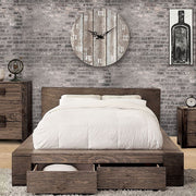 Visually appealing with urban undertones, this wooden collection is perfect for open spaces such as lofts. A low-profile head and base design with natural wood grain patterns create a comfortable appeal, with drawers on the footboard for practical storage.