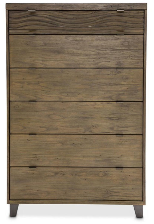 Roxbury Park Collection by AICO Furniture Stainless Steel finish Chest features wood frames with Figured Ash Veneer and a Slate Finish Drawer fro...
