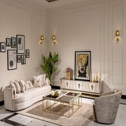 AICO Carmela Cocktail Table in Shimmer Ivory LFR-CRMA201-141. The finishing touch to your living room. This stunning table features a shimmering ivory finish that perfectly complements your living room and a mirrored top in a unique 4 section pattern that adds a touch of intrigue and sophistication. The legs of the table are finished in titanium gold. This cocktail table is perfect for entertaining guests, holding drinks and snacks, or simply adding a touch of style to your living room. Pair it with the rest of the Carmela collection for a complete look that exudes refined romance and understated elegance. This cocktail table will take center stage in your living room.
