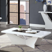 DUBENDORF Coffee Table, White, 47 1/4"L X 23 5/8"W X 15"H, 74.8lbs. Who's up for some futuristic decor? Paired with other modern pieces, this table set will push your room a few decades forward in the timeline. Much of this is due to the high gloss finish; each table top sheens with a reflective glow. The geometric base holds up the main table top featuring a black tempered glass insert in its center. If making a statement is what you want, you cannot go wrong with a set like this.