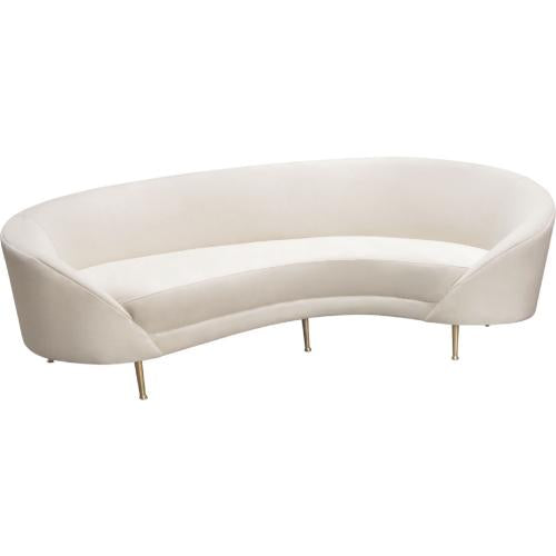 Celine Curved Sofa with Contoured Back in Light Cream Velvet and Gold Metal Legs