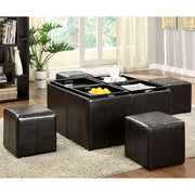 Accent any living area with this multi-functional storage ottoman. Four individual cubes can be removed and used for extra seating, and each comes with a built-in tray. Top can be used as trays. Upholstered in espresso leatherette.