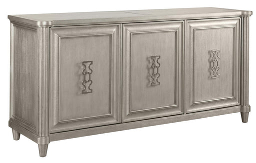 Morrissey Collection by A.R.T Furniture Constructed of parawood solids and prima vera veneers 3 Doors Fluted corner pilasters Inset stone top 3 Ca...