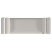 Complete a stylish, sophisticated living area or master suite with a modern upholstered bench. The backless design includes straight track arms, setting an austere silhouette. A pair of round bolster pillows soften the look and offer impeccable comfort and style. The bench seat cushion features foam fill, perfect for comfort in any space. The bench sits on a wooden bench and tapering legs, both receiving a black finish that creates lovely contrast and dimensionality.