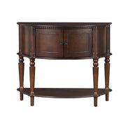 This traditional console table offers elegant storage with its curved demilune shape and warm brown finish. Constructed from poplar, engineered wood, and birch veneer, it features two paneled doors for concealed storage and a lower open shelf for display or extra organization. Turned legs and fluted detailing add classic charm, making it a perfect fit for entryways, living rooms, or transitional spaces.