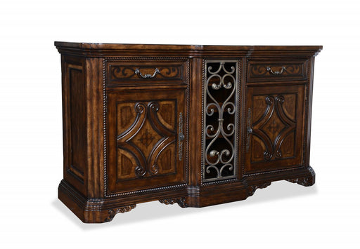 Gorgeous scrolling veneer and overlay patterns complemented with rich detail carvings Stone top Wrought iron d��cor with cast metal accents 2 Draw...