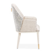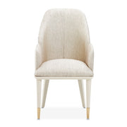 AICO Furniture Lisbon Arm Chair in Silken Matte Cream LFR-LSBN004A-140. Introducing the Lisbon Dining Arm Chair—a blend of comfort and modern design for your dining space. Upholstered in Jacquard Chenille fabric interwoven with shimmering Lurex threads, it adds a subtle sparkle to your decor. The chair features a contoured back and curved arms for supportive seating. Its matte cream lacquered legs, accented with brass-plated tips, offer a refined touch that enhances any dining area.