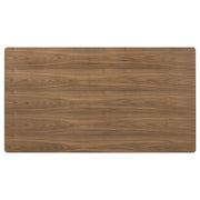 Accentuate the inviting style of your kitchen or dining room with a modern rectangular dining set. It offers fresh, contemporary flair with a walnut wood grain finish paired with beige upholstery on its chairs. The table features a trestle base and round post legs, offering casual ambiance for a welcoming home. Chairs are designed with wooden back and wedge details that add movement and character. Foam seat cushions are upholstered in beige fabric, offering neutral contrast and providing exceptional comfort and support for delicious meals.
