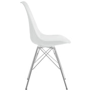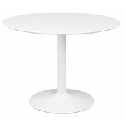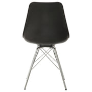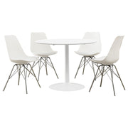 In a room bathed in soft, natural light, the contemporary dining table stands as an ode to minimalist elegance, its round silhouette offering a canvas for intimate gatherings. The pedestal-style base, a nod to mid-century design, rises from the floor in a smooth, powder-coated embrace, anchoring the space with a whisper of nostalgia. Accompanied by four chairs that marry the iconic Eiffel design with modern sensibilities, their sleek black shells cradle a cushion of comfort, while the dazzle of chrome legs catches the eye and reflects the room's airy ambiance. This dining set, effortlessly sophisticated, is as suited for a lively game of cards as it is for a tranquil morning, coffee cup in hand.