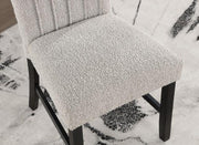 Spice up your space with an unexpected twist in textures! An interesting take on the classic parson chair, these are upholstered in boucle fabric with vertical pleats that add visual height. Black-finished legs and stretcherss ensure that the fabric is the star of the show.