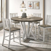 DAKOTA Counter Ht. Table, A. White/Ash Brown, 48"DIA X 36"H, 106lbs. Want a lovely way to start every morning? How about a cozy breakfast on this rustic dinette? The two-tone finish is the star in this ensemble--the table top and seats in warm ash brown color contrasts dramatically with the antique white body frames. They share the same knotty oak veneer that shows multiple dark lines and wood grain, giving the set its natural warmth. Holding up the table top are four bars supported with four legs in a unique pedestal configuration. The diagonal lines create a silhouette that's strictly farmhouse in style.