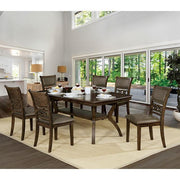 Holly Satin Walnut Dining Table, 66"L X 40"W X 30"H, 92.4lbs. Give your dining room a new flow to it with this dining collection. The table features rounded ends and a flowing leg base design that holds up an open storage shelf. The shelving is as decorative as it is functional depending on how you want to make use of it. The side chairs complement the table with gray leatherette padding. Ringlet cut outs add a touch of playful decoration to the seat to give a distinctive look and sense of style. Features: Open Lower Shelf Padded Leatherette Chairs Ring Cut Chair Back