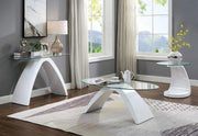 NAHARA End Table, 22"DIA X 23 3/8"H, 53.9lbs. It's a design that appeals to the imagination, an ambitious departure from typical table styles that haven't advanced enough over the years to keep up with evolving tastes. Each has a high-gloss wood base and elliptical tempered glass top. Individually or as a set they establish a mind-bending look worthy of the daring eye.