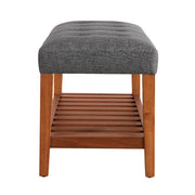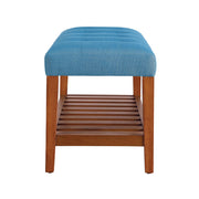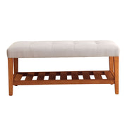 Simplistic lines pulling from the craftsman era and tapered legs to add some style, the Charla bench with button tufted full box seat can easily compliment any home styling Decor. The added width of the bottom slats serves as a function shelf. There are 4 fabric colors offered: Light gray, beige, blue, and gray.