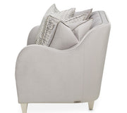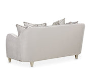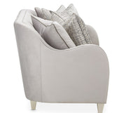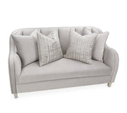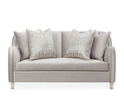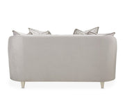• Loveseat is upholstered in pale gray velvet