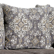 A stylish combination of lustrous gray chenille and weathered white wood, this living room set is a truly dynamic take on an already classic design. The contrast between these two materials provides an authentic antique dynamic, coupled with multiple elements emphasizing the traditional motif--rolled arms, faux wood frame carvings, and cabriole legs. And even though the larger pillows feature conservative patterns in keeping up with the style, a subtle hint of modern can be found on the smaller, shiny throw pillows.
