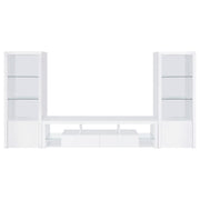 Elevate your entertainment arena with our sleek, modern TV stand. Drenched in a pristine glossy white-on-white finish, it radiates sophistication, accentuated by clear glass details. Its soft-close drawers ensure smooth operation, while glass shelves present a chic display option. Generous storage compartments cater to all your media needs. To enhance the ensemble, the set comes with matching media towers, amplifying storage capacity and offering a unified, stylish appearance. This combo not only meets functional demands but also serves as a captivating focal point in any contemporary space.