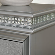 Create a room made for a princess with this bedroom set from the Maddie Collection. The curved headboard is padded and upholstered in a horizontally-tufted fabric, emphasizing the pearl white finish. The dresser and chest feature acrylic legs, crystal accents, and a beveled mirror with a LED light creating a glamorous aesthetic. Give into your glitzy side with this opulent set.