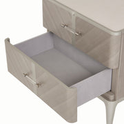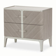 AICO Lanterna Nightstand in Silver Mist N9032040-823. Live in the future of chic sophistication. A mix of elegant curves and sloping patterns makes the Lanterna Nightstand the perfect piece to polish your bedroom with.