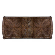 Beautiful wood inlay details and a dramatic trestle base create a grand statement with elegance galore. The ivory fabric upholstery provides a stunning contrast against the rustic natural tone finish for a look that is as cozy as it is chic. Intricate leg designs play beautifully off the delicately cut backs for a look that will inspire and amaze.
