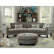 SARIN Warm Gray Sectional, 129 1/2"L X 37 3/8"W X 32 1/4"H, 207lbs. Create a luxurious and sophisticated living room with this uniquely shaped sectional . Curved for design and comfort, the sectional features a tufted back paired with sloped armrests, all for a modern appeal. Matching accent pillows, available in two different sizes, add a charming touch. Features: Contemporary Style Rounded Design Sloped-Style Arms Linen-like Fabric Optional Ottoman Available Pillows Included Solid Wood, Others Warm Gray