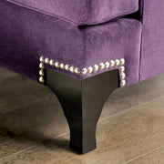 Sisseton Purple Love Seat, 71"L X 37"W X 36"H, 130lbs. Low arms that sweep up to the back and a dainty nailhead trim dotting around the feet give this sofa collection its stunning looks. The throw pillows feature a variety of designs that pop and give a stunning counter to the solid upholstery of the pie ces. Comforting foam fills the plump box cushion seating and loose back pillows for an ultra comforting seat. Features: Medium Density Foam Sloped Arms T-Cushion Seats Nailhead trim Loose Back Pillows Cabriole Feet Pillows Included