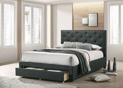 Comfort and functionality are the hallmarks of this fully upholstered, mattress-ready bed. On the comfort side, there's the rich linen-like fabric that wraps around the frame of the bed, culminating in a simple rectangular headboard with beautiful diamond tufting. Functionality-wise, the foot end of the bed is a smooth rolling drawer with casters; it's the perfect storage spot for any extra pillows or beddings within arm's reach.