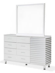 Aico Horizons Wall Mirror in Cloud White 9012260-108. The sleek design and innovative features of Horizons exemplify a European contemporary aesthetic. Clean lines and the alluring weaving of the "Cloud White" finish with bands of brushed metal creates a modern ambiance.