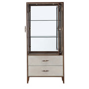 AICO Furniture Houston Display Cabinet in Walnut 9095209-416. The Houston Display Cabinet combines modern refinement with practical elegance. Crafted in a rich walnut finish, its beveled glass doors open to reveal spacious shelves, each adjustable to accommodate your display needs. Integrated LED lighting illuminates your collections, while the mirrored back panel enhances the depth and brilliance of your showcased pieces. Below, two velvet-lined drawers with soft-closing glides offer concealed storage, accented by a contrasting starburst-patterned gray front with a subtly textured surface. Gold trim outlines the design, while the sleek wood-and-metal handles complete the look with a sophisticated touch.