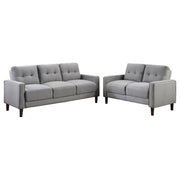 Ideal for studio apartments or small rooms, this sofa collection boasts a perfect small-scale design. Its classic track arm and self-welt detailing highlight the superior tailoring. The grid-tufted boxed back cushions and pocket coil spring cushion construction ensure comfort and support. With brown tall round tapered legs, it offers a sturdy foundation. Assembly is a breeze, and its solution-dyed performance fabric is easy to clean.
