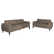Welcome to the pinnacle of modern design with our sofa collection, where elegance meets innovation in a "frame within a frame" concept. This series, draped in a chic fabric, showcases an exquisite blend of clean lines accentuated by detailed topstitching. The track arms, enhanced with mitered front accents, further amplify its contemporary aesthetic. Prioritizing your relaxation, these sofas come equipped with reversible back cushions and a pocket coil seat construction, guaranteeing both coziness and lasting support. Elevating the design even further are the tall, black cylinder-shaped wooden legs, adding a touch of sophistication. This collection is not just about seating; it's an embodiment of style and comfort, curated for the modern home.