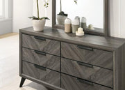 The diagonal replicated grain meet at the center line, forming a V-shaped pattern found on the front panels. Contemporary elements continue throughout this ensemble, with the black angled legs and sleek finger pulls found on the matching case goods. Coordinating pieces like this set offer a stress-free experience in updating your bedroom decor.
