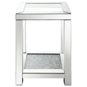 Transform your living space with this glam mirrored coffee table set. Featuring mirrored frames with beveled mirror trim and tempered clear glass tops, these pieces exude modern flair and Hollywood Regency vibes. The sparkling acrylic jewel-encrusted bottom shelves add a dazzling touch, while the mirror tile accents elevate their chic, refined design. Perfect for glamorous interiors, this set offers a blend of luxury and functionality.